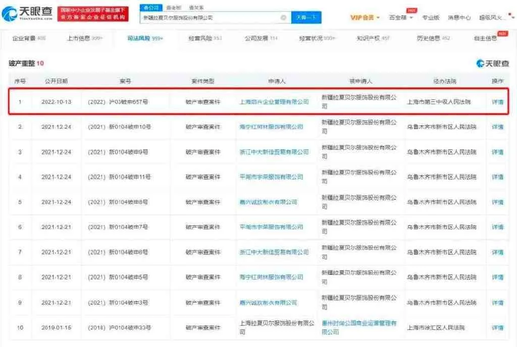 天眼查App显示,10月13日,新疆拉夏贝尔服饰股份有限公司新增一则破产审查案件,申请人为上海启卉企业管理有限公司,经办法院为上海市第三中级人民法院。目前,该公司已多次被申请破产重整。新疆拉夏贝尔服饰股份有限公司成立于2001年3月,注册资本约5.48亿人民币,法定代表人为吴金应。风险信息显示,该公司目前存在多条被执行人、失信被执行人、限制消费令及终本案件信息,未履行总金额超5.7亿。