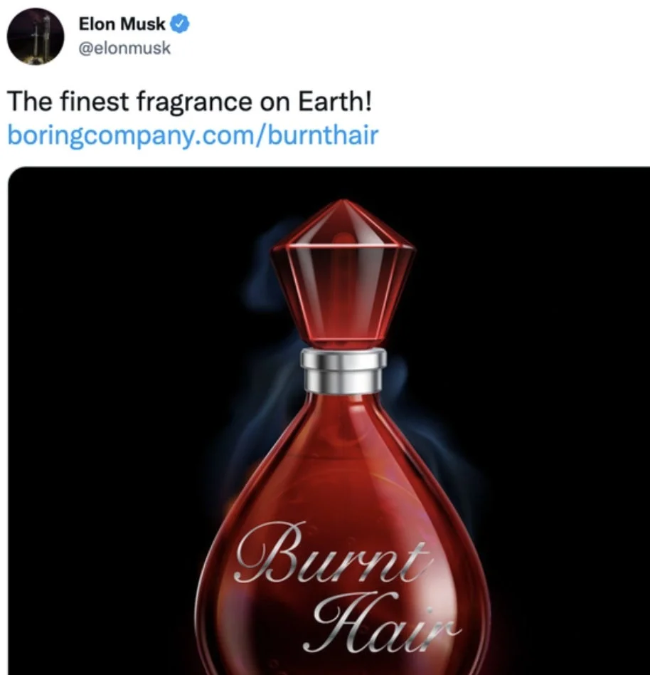 据《猎云网》消息,近日特斯拉CEO埃隆·马斯克发布了一款名为“烧焦的头发”(Burnt Hair)的瓶装香水,并称其为“地球上最好的香水”。为了推广这款产品,马斯克将自己的推特账号个人简介改成了“香水销售员”。当地时间周三,马斯克宣布,已卖出1万多瓶新款香水,总销售额超过100万美元。他还在推特上表示:“请买我的香水,这样我就可以买推特了”。今年9月,马斯克曾在Twitter上预告过这种香水,这款香水由马斯克旗下Boring Company公司生产,将于2023年第一季度出货。另外,这款香水还允许用户使用狗狗币来支付。之前,马斯克也曾推出多款猎奇产品,包括特斯拉品牌的龙舌兰酒、皮卡造型的口哨、短裤和火焰喷射器等。