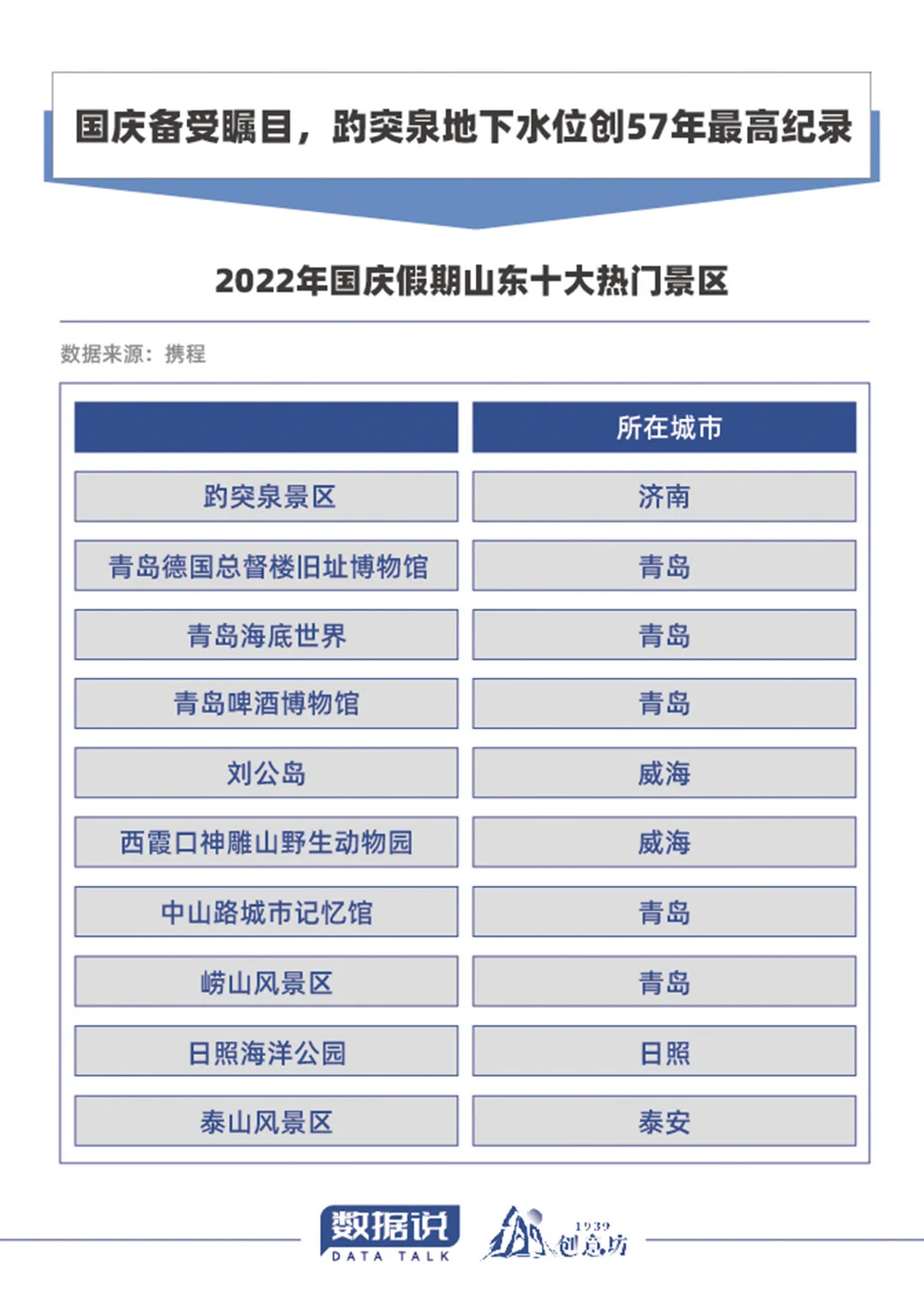 这个国庆,最受瞩目的景点在哪里?根据携程发布的“2022年国庆假期山东十大热门景区”,济南趵突泉荣登榜首,青岛上榜景区数量最多。