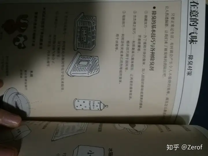 比如这一页讲到如何除去房间异味。自己在外面租房子,刚出来没什么工作经验工资又不高,租的房子不到25平方米,里面还集合了冰箱,洗手间等配置。住了两天,始终都觉得空气中弥漫着一股怪怪的味道,某天下午闲来无事信手查阅房间收纳的相关技巧,正好看到了除臭这方面的知识点,这方面内容短小实用,按照书里的提示,选了两种除臭剂,和活性碳包,现在屋子里味道很清新,心情都舒畅了许多。