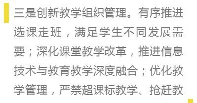二是强化课堂主阵地作用,着力解决课堂教学质量不高的问题。坚持把课堂教学作为提高义务教育质量的主要环节,既强调创新教学方式方法,促进信息技术与教育教学的深度融合应用,也强化教学规范管理,对作业考试辅导等作出制度性安排。