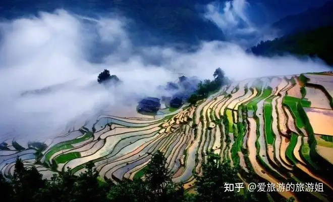 秋季是欣赏秋天金色的田野的最好时机,夕阳西下时,远山如黛,近处梯田水光闪闪。