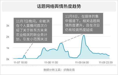 舆情分析:经过互联网舆情分析平台识微商情监测分析数据显示,在直播当晚,话题引起了小范围的舆情关注;11月8日,在媒体的集中报道下,相关话题舆情热度骤升,且在次日仍有较高热度延续。话题下的情绪表达以占比79%的正面评论为主,有夸奖它的,也有因此对其新业务做出祝福与表示支持的。但也有12%的中立评论对此持保留意见,9%的负面评论持消极态度......