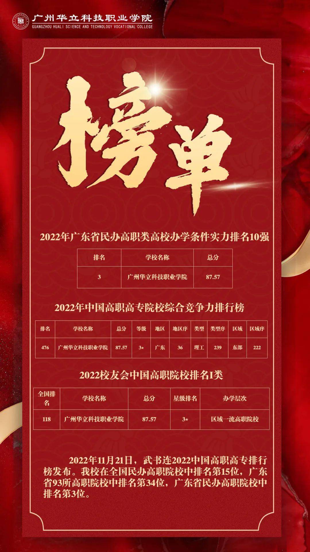 在“武书连2022中国高职高专排行榜”中全国民办院校位列第十五(省内第三);