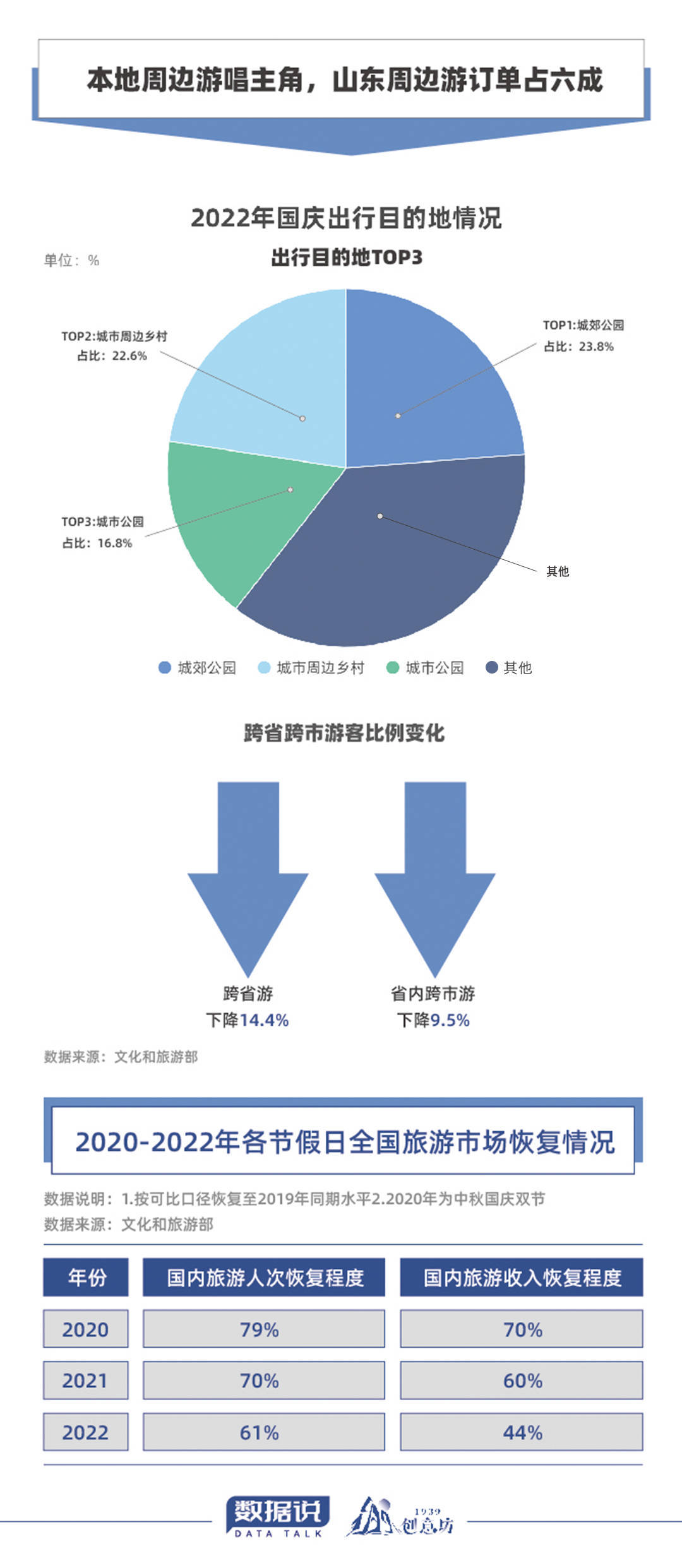 国庆长假画上句号,相关的出行大数据新鲜出炉。这个国庆,全国共有4.22亿人次出游,本地游、周边游仍为出行首选,郊野露营蹿红,山东露营地数量一不小心又拿了个全国第一。除此之外,今年国庆,文旅方面还有哪些亮点呢?不妨透过数据了解一下。