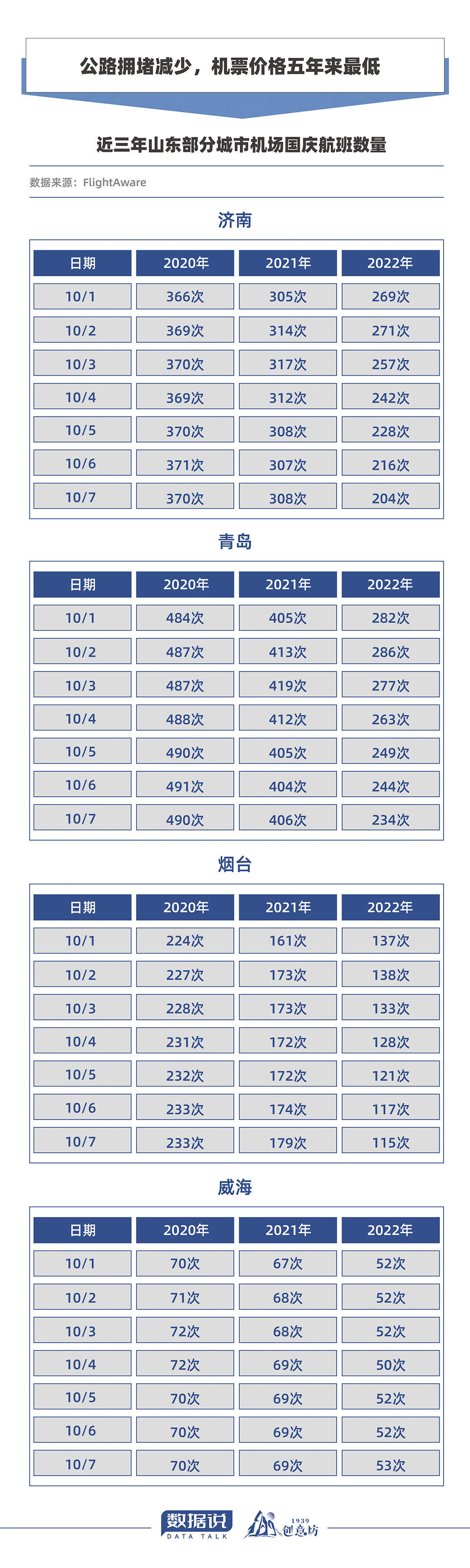 山东各个机场的航班数据也与全国的大趋势一致。根据航班数据平台FlightAware,今年国庆期间济南、青岛、烟台、威海等地机场的航班数量相比前两年均有减少。