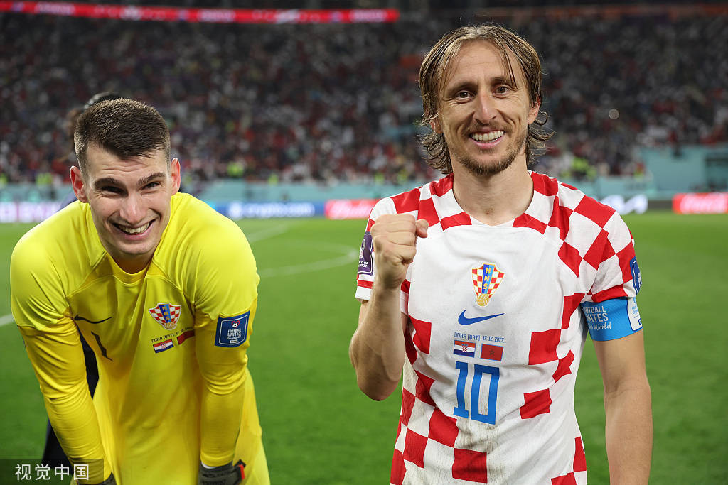 克罗地亚VS摩洛哥,比赛结束后的克罗地亚的门将利瓦科维奇和莫德里奇。