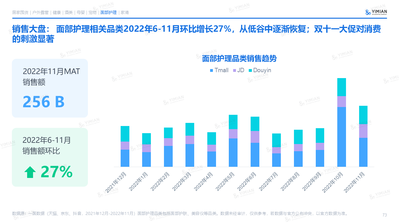 以面部护理品类为例,2022年6-11月面部护理环比增长明显,从低谷中逐渐恢复。