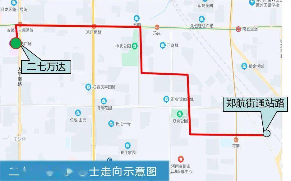 线路功能:该线路可满足鑫苑城、天地惠城、正商城裕园、金祥花园、冯庄小区等社区居民前往二七万达商圈购物需求。