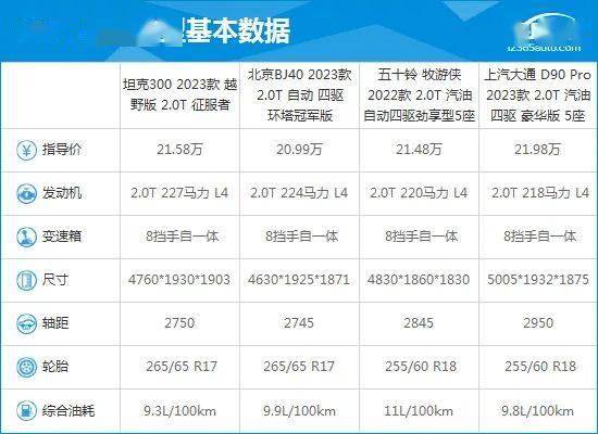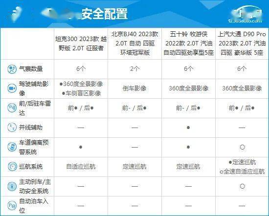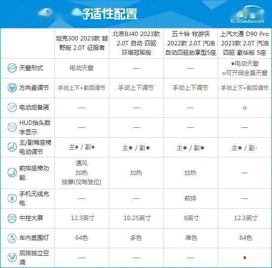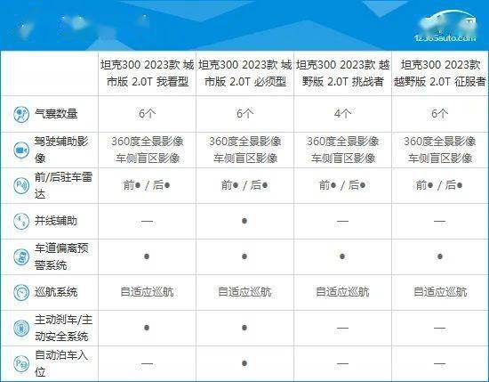 坦克300从售价来看,其主要竞争对手为20万元左右的硬派SUV车型,且直接竞品车型为北京BJ40。通过对比配置来看,坦克300整体表现较为出众,更能满足消费者日常使用需求。此外,坦克300不仅配有360度全景影像功能,并且还配有车侧盲区影像,以及自适应巡航功能,安全表现更为出色。同时,坦克300的前排座椅功能更加丰富,舒适性表现也要好于另外三款车型。