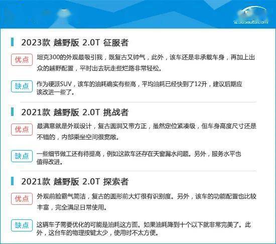 在用户口碑中,多数消费者对于坦克300的外观设计表示认可。作为硬派SUV,该车越野性能也值得肯定,外加丰富的配置,其综合素质表现较为出色,当然除了优点外,该车还是有需要改进提升的地方,例如油耗等方面。