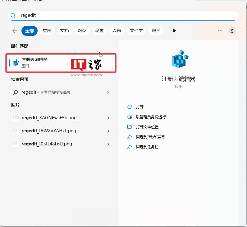 2. 在搜索框中搜索“regedit”(不需要完整输入),然后点击“注册表编辑器”