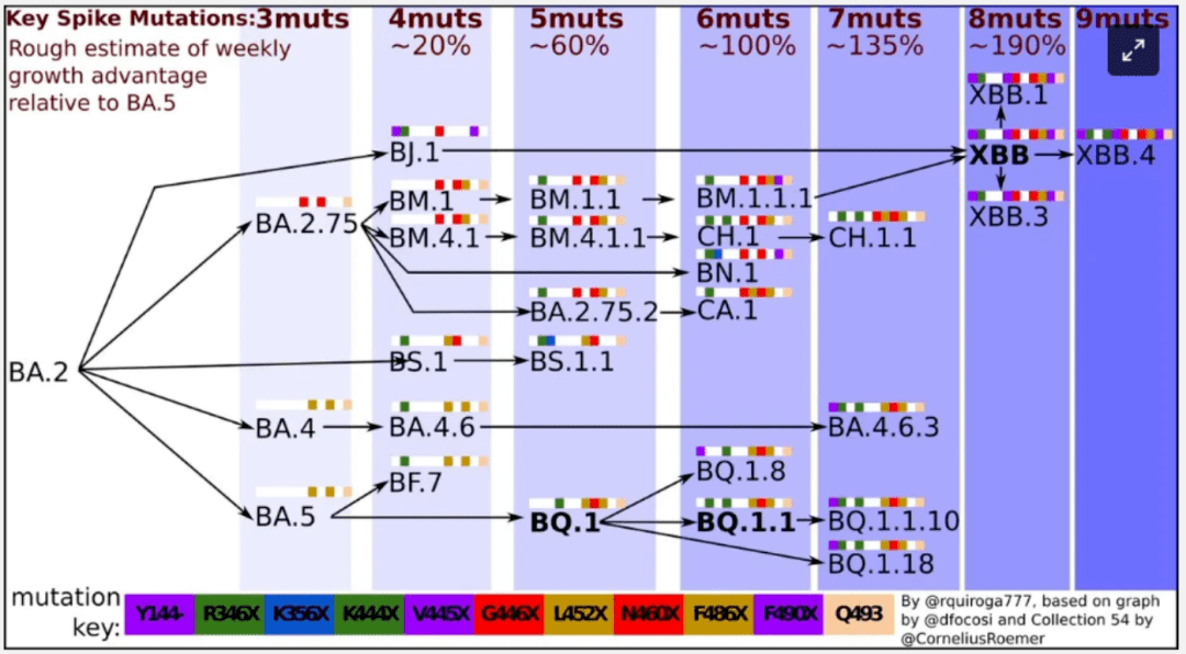 首先我们需要了解我们面对的这种有超级传染力的上呼吸道病毒。从2022年开始,全世界流行的新冠病毒株都属于奥米克隆家族。而奥米克隆家族的变异株也每几个月就在进化。目前欧美地区主要流行的是由BA.4 和BA.5进化而来的BQ.1, BQ.1.1。北京目前主要流行的BF.7毒株,以及广州主要的病株BA.5.2 就是从这一个分支而来。而东南亚地区流行的毒株主要是源于印度BA.2.75进一步进化而来的XBB毒株。见下图1.