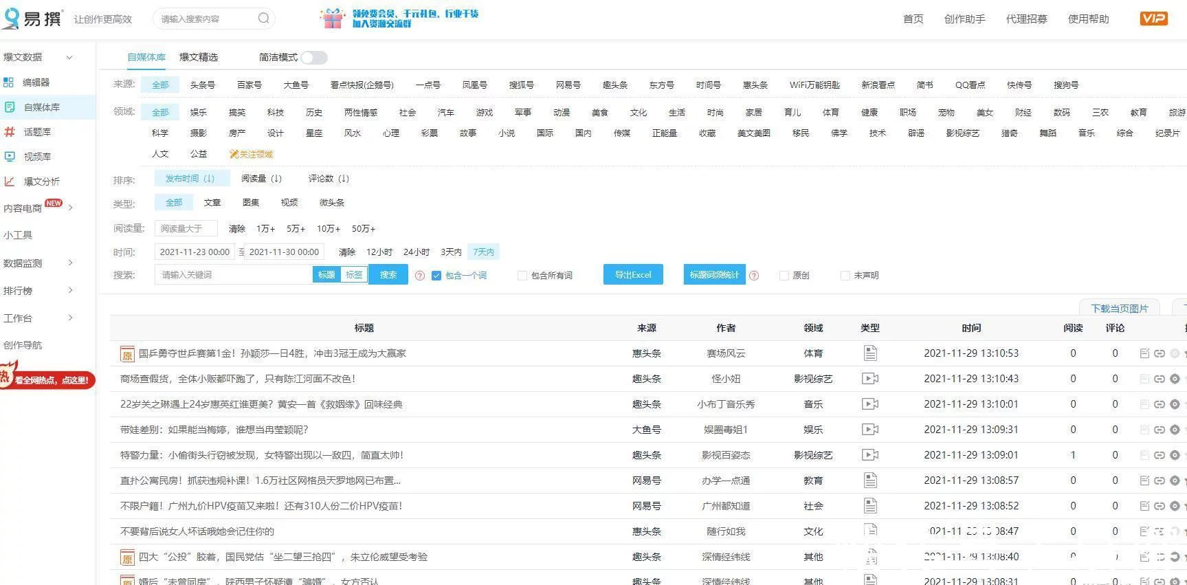 易撰可以说是一个自媒体老牌神器。易撰的爆文库,可以查看各个领域的爆文,还可以根据发布时间、阅读量等进行筛选,而易撰的爆文标题生成器,只要输入关键词,就可以生成多个爆文标题可供选择。