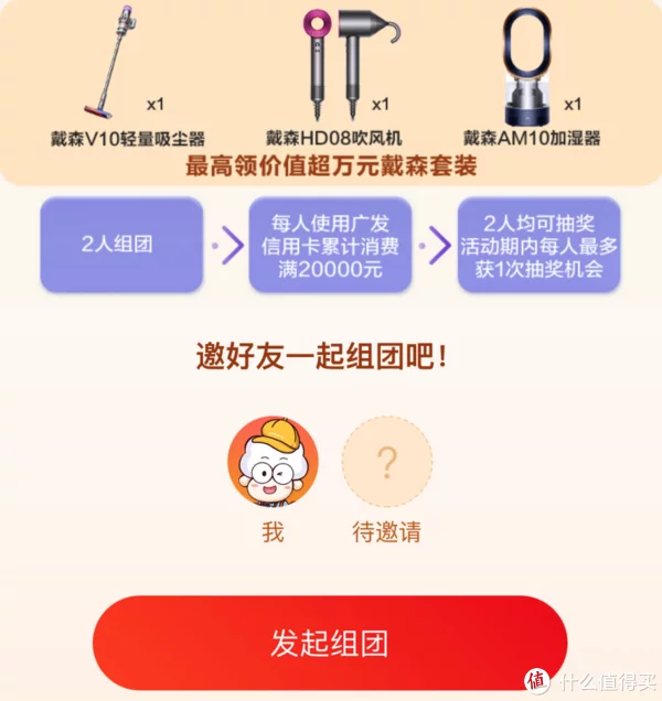 组团消费,当月邀请1名好友2人组团,自成团起,每人累计消费满20000元,2人均可去发现精彩APP抽奖1次,最高有机会获万元戴森套装!