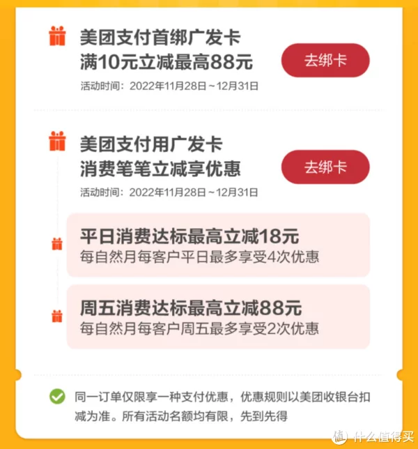 即日起至12月31日,在美团/美团外卖/大众点评APP,美团支付首绑广发信用卡,消费满10元最高立减88元。用广发信用卡消费笔笔立减享优惠,平日最高立减18元,周五最高立减88元。