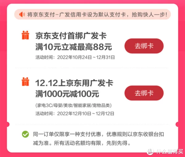 12月10日-12月12日,每天0点起,购买美妆/家电3C/宠物品类/智能家居/母婴,付款选广发信用卡支付有机会享满1000-100元。如果没绑卡的,12月31日前,京东支付首绑广发卡,还可享满10元最高立减88元。