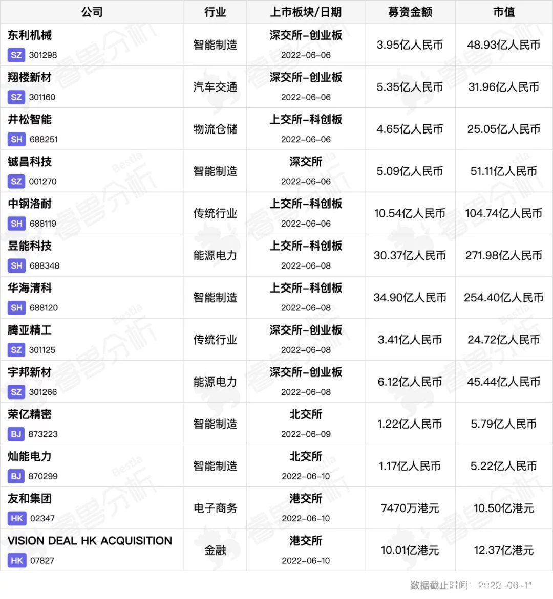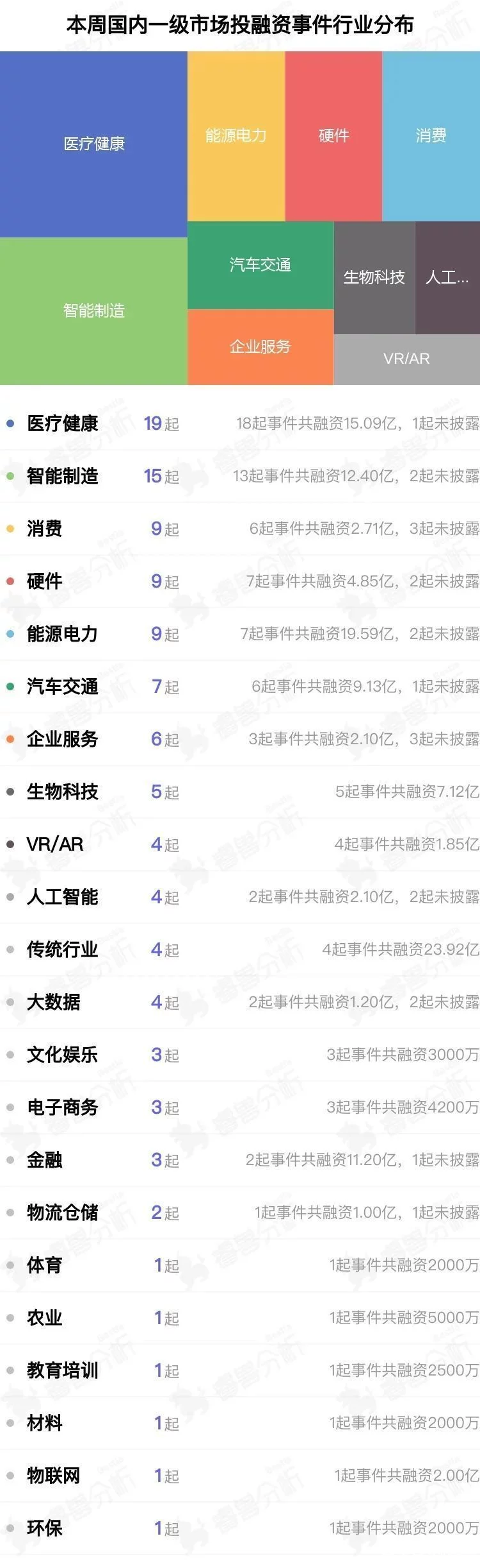 比亚迪总市值突破万亿元,王传福成为中国大陆第六大富豪比亚迪10日A股股价大涨8.19%,收盘时达348.8元/股,市值1.02万亿元,成为首个进入“万亿市值俱乐部”的中国车企。目前全球车企市值前三名为特斯拉(约合人民币4.8亿元)、丰田(约合人民币1.5亿元)、比亚迪。从彭博亿万指数发现,比亚迪创始人王传福成为2022年中国大陆身家涨幅最大的人,其身家今年以来已大增30.8亿美元至257亿美元(约合人民币1717亿元),成为中国大陆第六大富豪。快狗打车通过港交所上市聆讯港交所披露,快狗打车控股有限公司通过港交所上市聆讯。中金、UBS、交银国际、农银国际为联席保荐人。快狗打车前身为58速运,隶属于到家集团,旗下包括两个品牌——中国香港及海外市场的“GOGOX”和中国大陆的“快狗打车”,服务各类托运人。B站:双重主要上市已获港交所确认,预计10月生效B站表示,今年3月,B站就转换为在港主要上市向香港联交所提出申请,目前已获得港交所确认,预计生效时间为10月3日。生效后,B站将成为在港交所及美国纳斯达克双重主要上市公司。卫哲参与发起的SPAC上市由嘉御资本创始人兼董事长卫哲联合DealGlobe易界和Opus创富投行发起的特殊目的收购公司——Vision Deal HKAcquisition Corporation于2022年6月10日正式在香港联交所挂牌上市,花旗和海通国际担任联席保荐人。本周(06.04-06.10)全球投融资概览根据睿兽分析监测数据,本周国内一级市披露90个投资事件,与上周相比增加2个,其中已披露融资金额的事件为72个,披露总金额为101.15亿人民币,平均融资为1.12亿人民币。本周国内投融资事件行业分布从融资案例数量来看,本周医疗健康(19个)、智能制造(15个)领域最为活跃。从已披露金额事件的融资规模来看,本周传统行业位居第一,融资总规模约为23.92亿人民币,主要原因为房地产开发商「四达实业」获得万科23亿人民币的战略投资。四达实业是一家房地产开发商,隶属绿景中国地产旗下,该公司持有位于深圳市南山区白石洲的旧改项目,并从事项目的开发、建造服务。交易完成之后,四达实业股权将由绿景中国地产持有92%股权,万科持有8%股权。能源电力融资规模本周排名第二,已披露融资总额为19.59亿人民币。绿色科技公司远景智能(Envision Digital)获得2.1亿美元A轮融资,本轮融资由红杉中国领投、GIC参投。远景智能成立于2014年,是远景科技集团(Envision Group)旗下从事低碳和Alot技术的公司,远景智能构建AIoT智能物联操作系统 ——EnOS,为智慧能源、智慧建筑、智慧工厂、智慧出行和智慧城市等客户提供解决方案和智能产品。远景科技集团董事长、总经理张雷硕士毕业于伦敦政治经济学院,于2007年从海外回国创办远景能源。