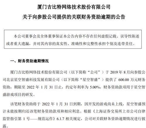 1月28日盘后,吉比特发布公告,披露给《纪元:变异》开发商星空智盛600万借款逾期。2019年8月时,吉比特向星空智盛提供了600万的财务资助,并约定借款29个月,年化利率5%。但由于《纪元:变异》延期,星空智盛无力在约定期限支付本息。吉比特表示财务资助逾期对公司无重大影响,后续会在《纪元:变异》上线后用销售分成抵扣财务资助本息。”