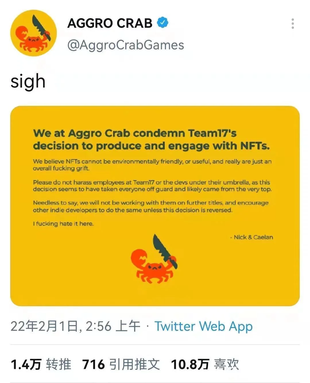 此前,曾与Team17合作过的游戏工作室Aggro Crab表示,如果Team17不取消NFT计划,它将不再与其进行合作。随后又有两家游戏公司发布了永不涉足NTF的声明并收获了大量网友的点赞。此外,网友甚至还创建了一个话题#TeamNoNFT ,以此表达对Team17的NFT计划的不满。在玩家和合作伙伴的集体炮轰下,Team17当日宣布放弃NFT计划。