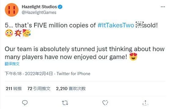 正式发售之后,《双人成行》的口碑也是水涨船高,甚至最后拿下了TGA年度最佳游戏的桂冠,成为了今年最受欢迎的独立游戏之一。而在近日,开发团队也在推特上表示,“《双人成行》的销量硬突破500万,我和我的小伙伴都惊呆了,想想会有多少玩家喜欢我们的游戏啊。”