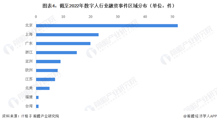 截止2022年12月,北京、上海、广东等地是我国中国数字人行业融资重点区域。其中,北京市投融资事件数量高达52件,是投融资事件数量最多的省市;其次为上海市,投融资事件数量超20件。