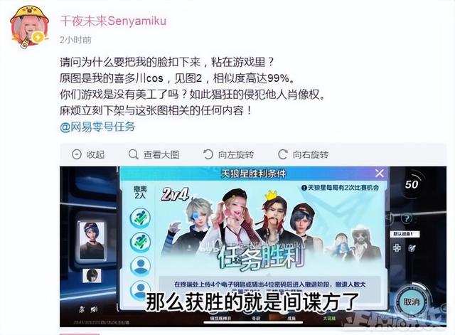 近日有着78万粉丝的美妆博主“千夜未来Senyamiku”发现,《零号任务》竟然直接扣下自己的COS喜多川海梦照片的头,贴到游戏角色的身上,面对如此猖狂的操作,她质疑官方是不是没美工了。