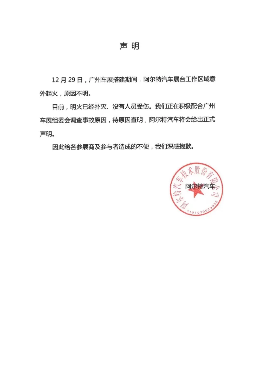 12月29日,阿尔特汽车发布声明回应“广州车展展台起火”。目前,明火已扑灭、没有人员受伤。阿尔特汽车正在积极配合广州车展组委会调查事故原因。(阿尔特汽车)