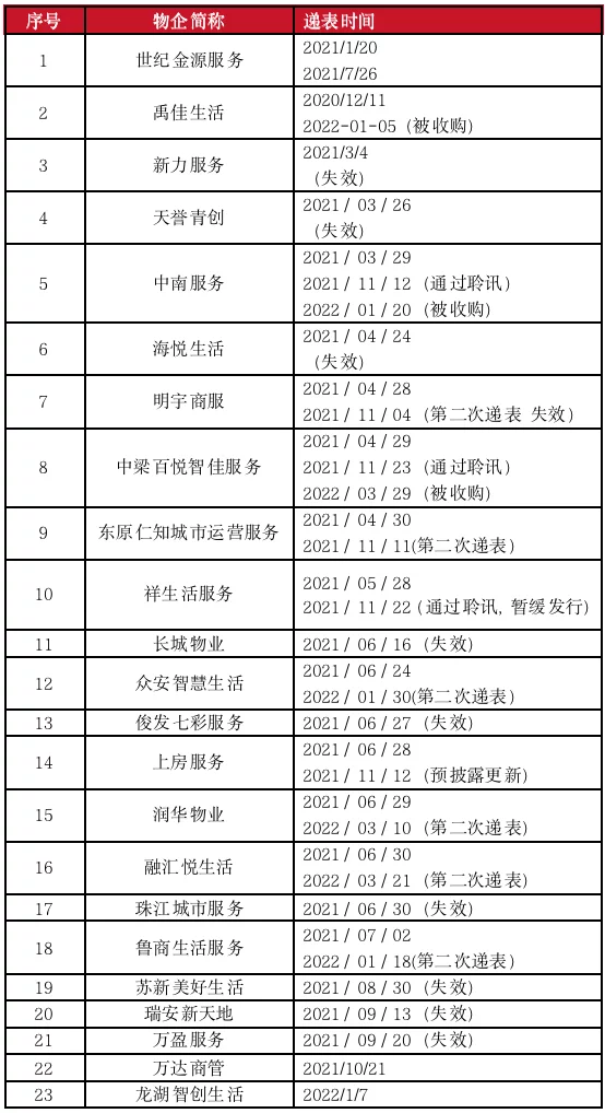 表:截止2022年3月31日递表物企最新明细