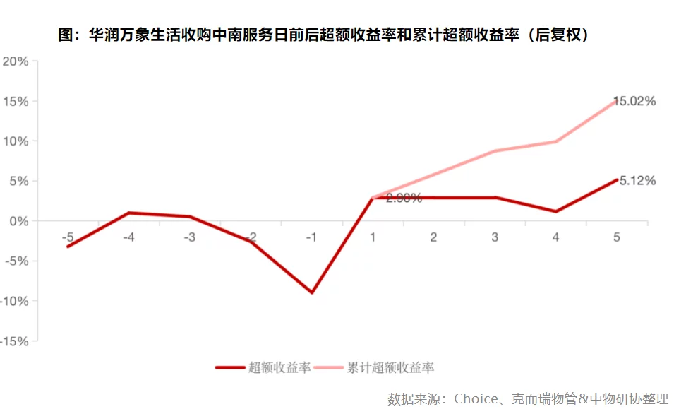 资本市场对并购事件的短期反应业颇为看好。以碧桂园服务收购中梁百悦智佳为例,事件日后的第一天超额收益率较低仅为1.97%,收购后第五日超额收益率和累计超额收益率分别达到4.37%和6.5%。