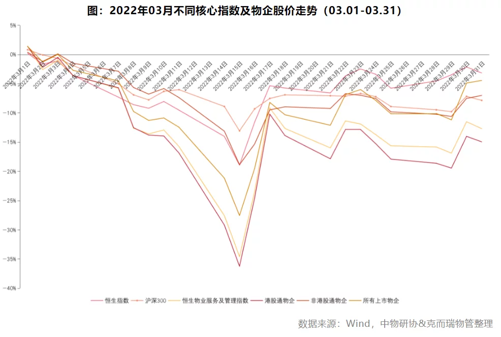 数据显示,3月55家上市物企(不含3月上市的金茂服务和力高健康生活)、非港股通物企、恒生物业服务及管理指数、港股通物企分别下跌4.4%、7.0%、12.7%和14.9%,跌幅均大于恒生指数(下跌3.2%)。