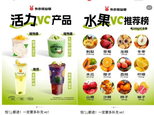 书亦是较为典型的案例,推出了10.1元购买50元维C补给包套餐,主要是以橙和柠檬为主的产品。在小红上,书亦烧仙草的的标题都是:“怕羊多进!一定要多补充vc”。