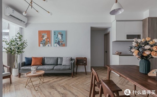 客厅以胡桃木色搭配冷色调,使得整个空间非常舒适宁静。阳台纳入客厅,扩大了空间感,让活动空间更为宽松。沙发采用皮质灰色调,局部点缀橙色和蓝色,让原本沉闷的空间有了几分活泼质感。木纹地砖采用人字拼铺贴,摆脱常规铺贴方式,多了几分设计美感。