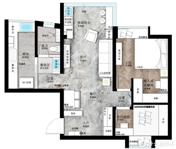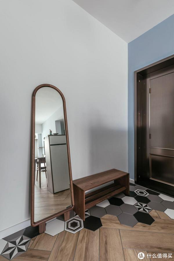 原本入户没有玄关,在不影响采光的前提下,设计了一组鞋帽矮柜,可收纳可隔断,同时实现步入式玄关,增加体验感。地面采用六角花砖拼接木纹地砖,整体不呆板更具趣味性。木质鞋柜搭配弧形穿衣镜,完善玄关功能,提升舒适体验。