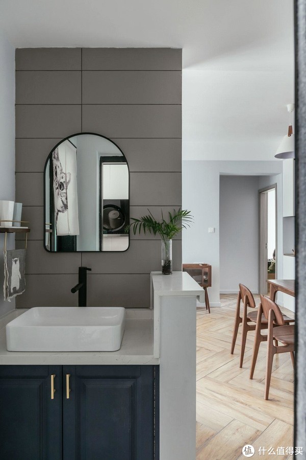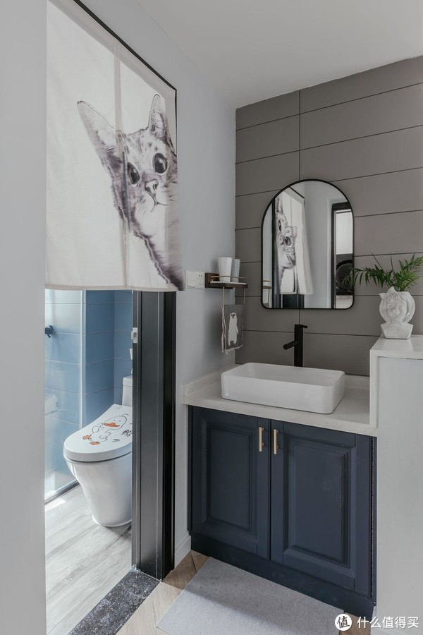 卫生间采用分离式设计,洗手台外置,不仅空间更为宽松,使用也变得更方便,早晚高峰期不担心拥挤。白色的洗脸台,搭配深蓝色浴室柜,还是相当耐看的。