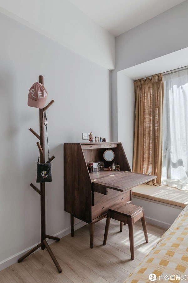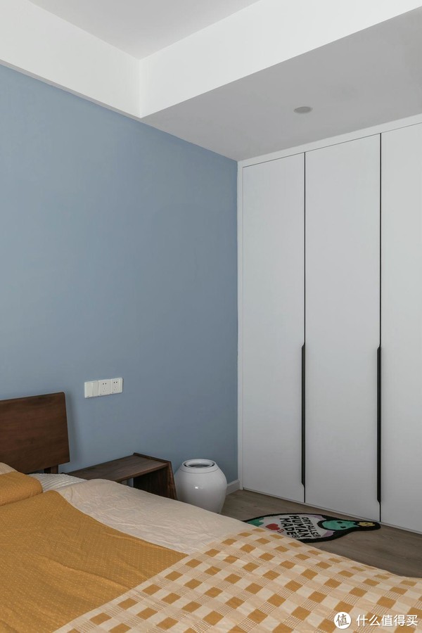 主卧敞亮而舒适,白色为主提亮空间,浅蓝色为床头背景,增添空间静谧。装修借用了部分次卧空间,打造了步入式衣帽间,增加了主卧收纳。胡桃木的衣架和斗柜,增添了几分稳重感,斗柜可展开,兼具梳妆台的功能。