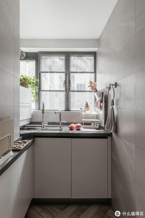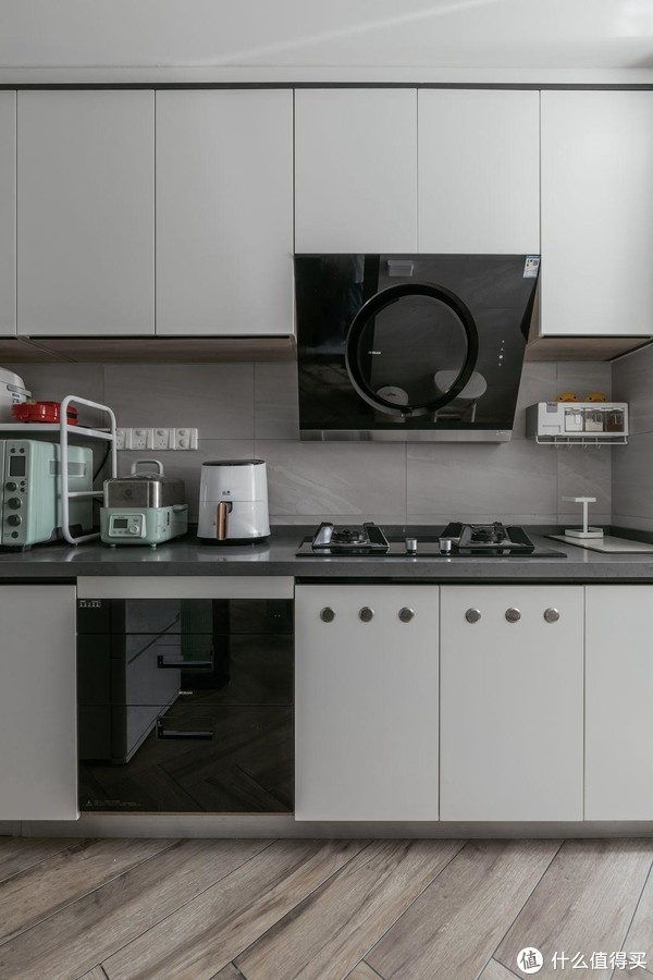 厨房干净整洁,各种小型家电非常的迷你可爱,很适合两个人居住使用。厨房吊柜和橱柜结合,提供了充足的收纳空间。操作台采用高低式设计,让厨房使用更加舒适。