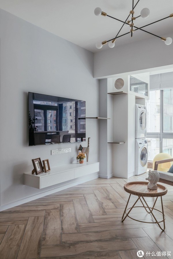 简洁干净的电视墙,设计上结合了阳台和猫咪生活习惯,打造出专属的猫“卧室”,攀爬跳跃让猫咪的天性得以释放。