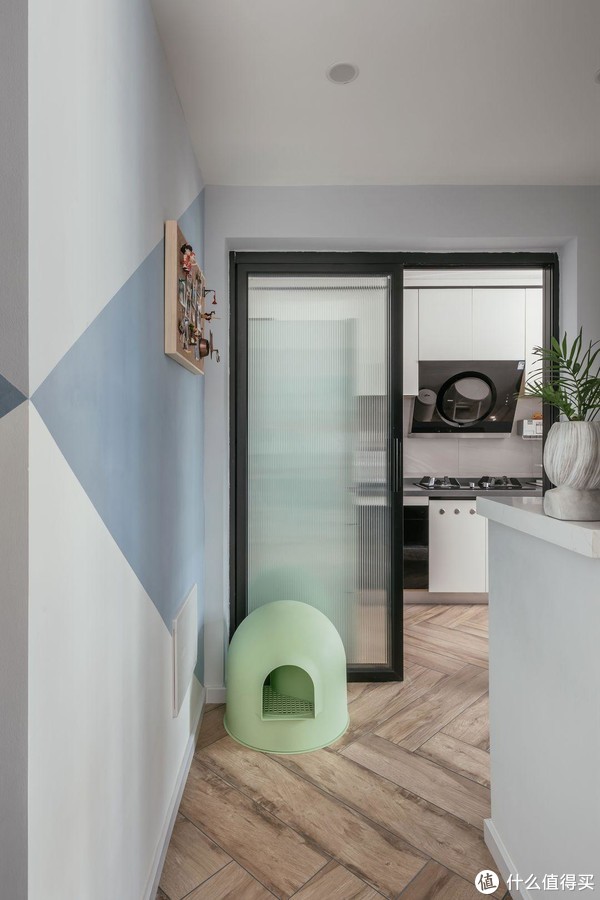 厨房位于过道末端,采用长虹玻璃推拉门隔断,明亮宽敞更具通透性。过道墙面和玄关区域一样,利用浅蓝色做几何造型,摆脱视觉单一的效果。