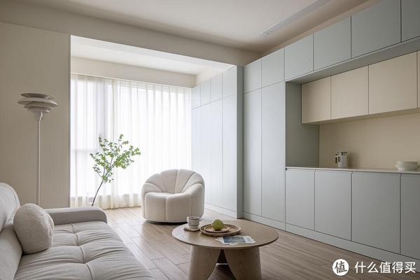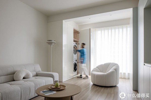 阳台纳入客厅,并不意味着空间上的浪费。沙发一侧设计一组储物柜,除了收纳之外,还将洗衣机和烘干机隐藏在内,保持空间整洁与美观。灵活的单人沙发,可以随时移动,享受休闲时光。