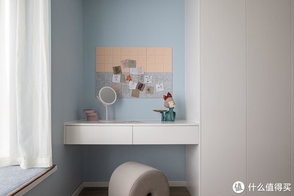 衣柜末端靠近飘窗的位置,设计了悬挂式抽屉书桌,满足女主人日常梳妆需求,抽屉式方便收纳化妆品,墙面软木板设计,用于记录生活之美。