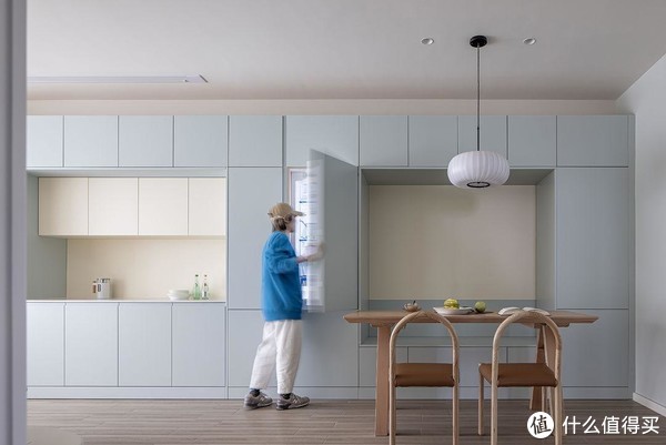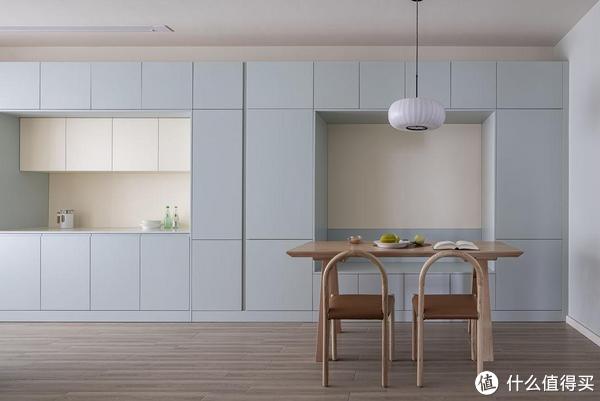 客厅电视墙直接定制储物柜,柜中柜加上不到顶的设计,拉伸出层次感。淡淡的蓝色和米白色结合,别有一番视觉感受。考虑电视使用频率不高,装修直接舍弃,在石膏吊顶内预埋隐藏式投影幕布。
