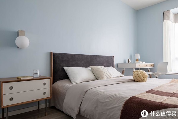 主卧轻微调整入门位置,同步定制衣柜将收纳空间最大化。整体以淡蓝色为主,平和不张扬,给人静谧、舒适的空间体验感。床头采用不对称设计,摆脱常见的布局,让空间更有活泼气质。