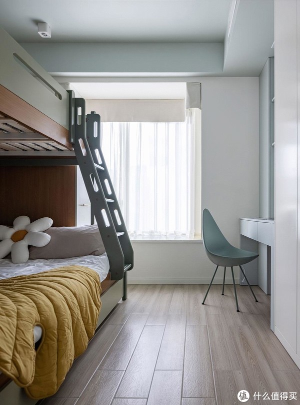 儿童房延续了简洁基调,空间有限选择了更加实用的高低床。空间设计上,借用了部分厨房空间,用于布置衣柜和书桌,让空间不那么拥挤。衣柜末端的写字台,收纳和隔板结合,满足了不同物品的收纳摆放,提高使用舒适感。