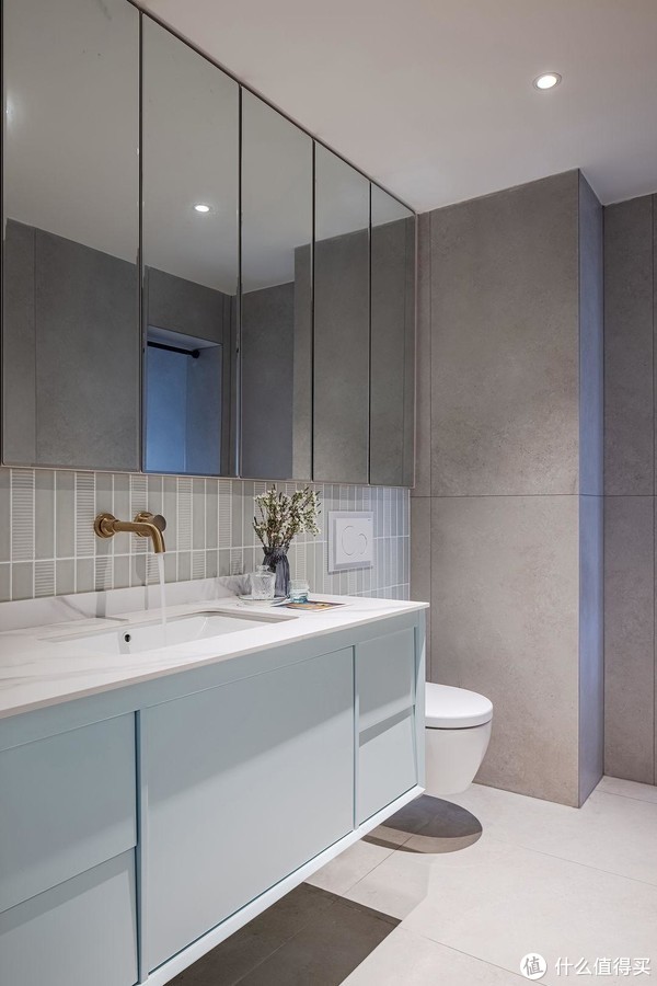 卫生间实用为前提,在不影响其他功能前提下,将洗脸台尺寸最大化,不仅收纳空间多了,连台面空间也更宽松,方便摆放洗漱用品。使用墙排马桶移位,上方增加储物空间,保证卫生间整洁。