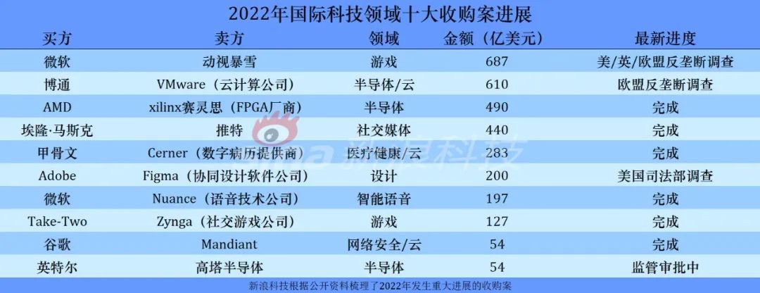 以下是新浪科技盘点的2022年国际科技领域十大收购案进展: