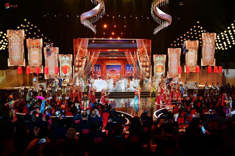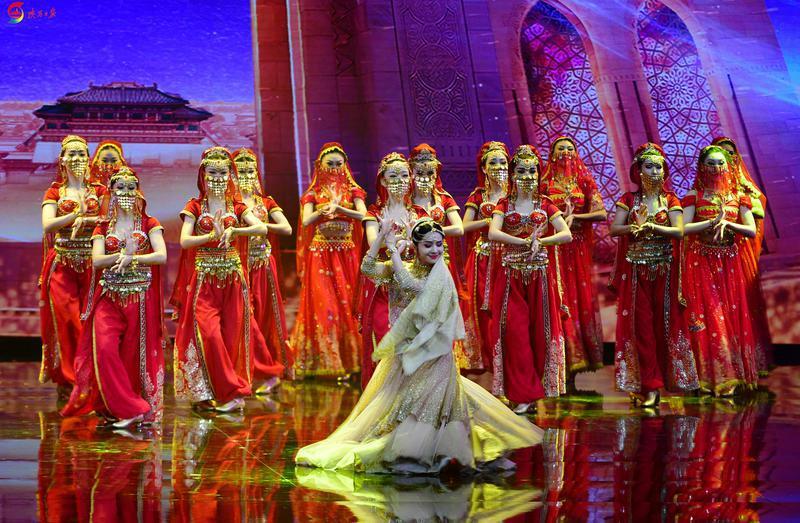 第九届丝绸之路国际电影节开幕式上,舞蹈演员正在演出情境歌舞剧《丝路智慧》。
