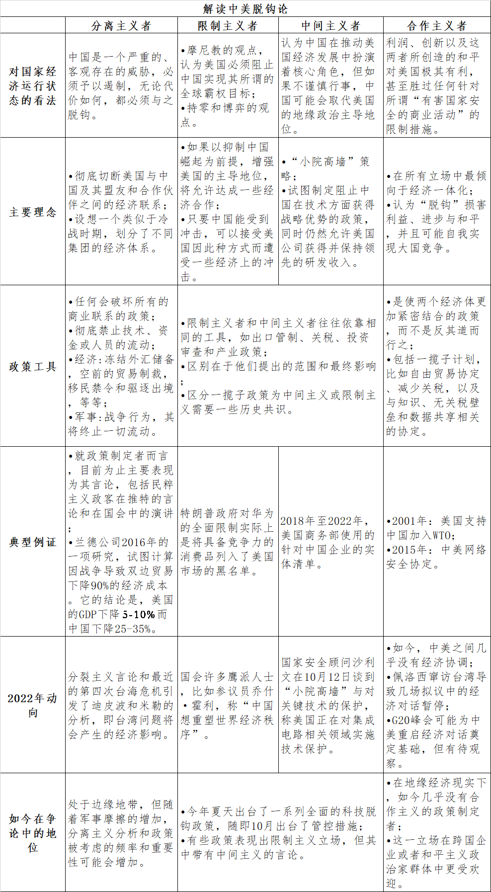 这种区别确实存在。限制主义者和合作主义者可能有相同的政策,但他们提出的范围和所产生的影响却各不相同。因此,专家之间需要达成一些历史共识。例如尽管依靠相同类型的政策工具,限制主义者将选择更深入的政策工具来尽可能多地切断美中之间的经济联系。在2022年夏天以及10月份实施了一系列全面的技术脱钩和技术管制政策之后,限制主义政策似乎正在取代拜登政府当前的中间主义政策。