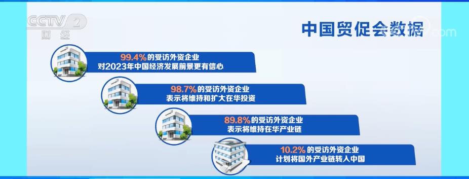中国经济稳中向好的趋势,也吸引着全球企业来华投资和扩大业务。中国贸促会近期对160多家在华外资企业和外国商协会进行了调研。结果显示,99.4%的受访外资企业对2023年中国经济发展前景更有信心,98.7%的受访外资企业表示将维持和扩大在华投资,89.8%的受访外资企业表示将维持在华产业链,10.2%的外资企业计划将国外产业链转入中国。