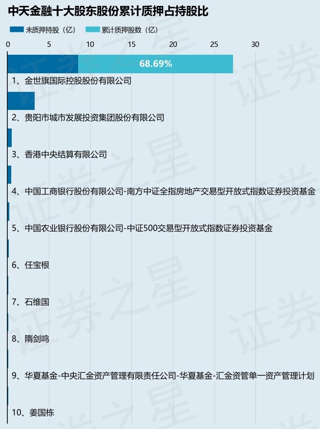 截止本公告日,股东金世旗国际控股股份有限公司已累计质押股份18.75亿股,占其持股总数的68.69%。本次质押后中天金融十大股东的累计质押股份占持股比例见下图: